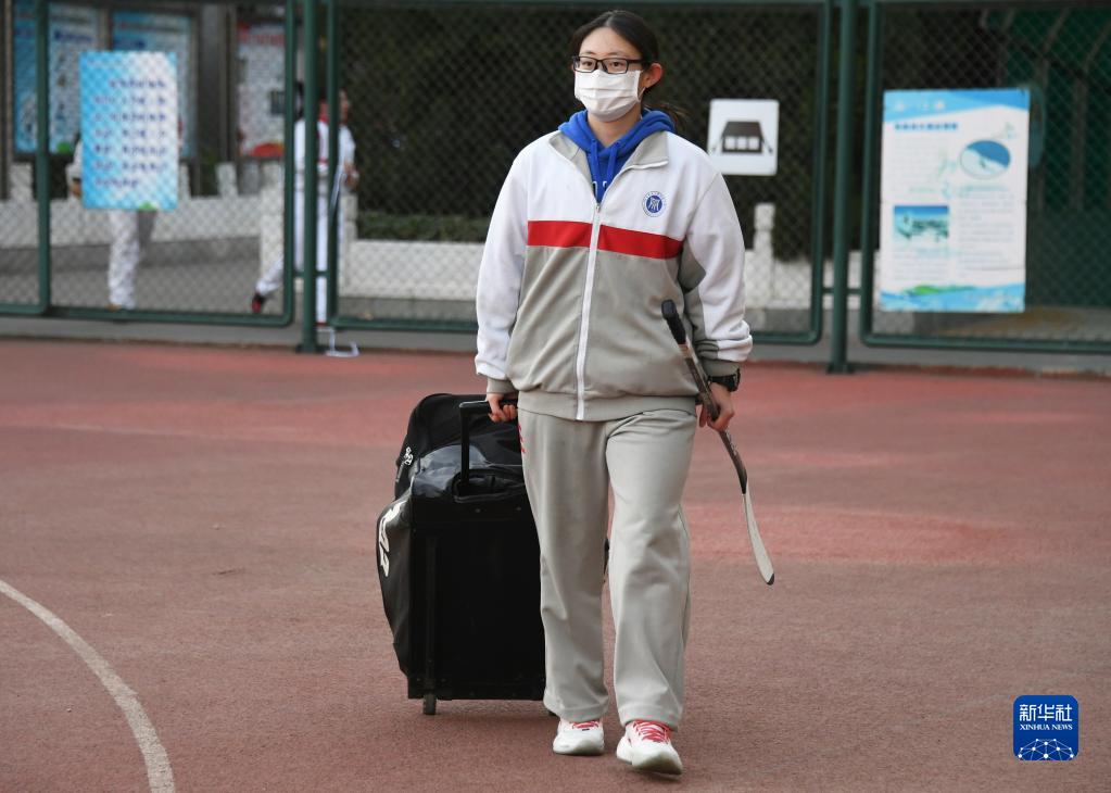 在北京科技大学附属中学,张蓝心前往冰上运动中心准备参加冰球训练(12月2日摄)。