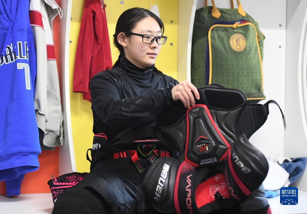 在北京科技大学附属中学冰上运动中心,张蓝心在队内比赛前穿戴装备(12月2日摄)。
