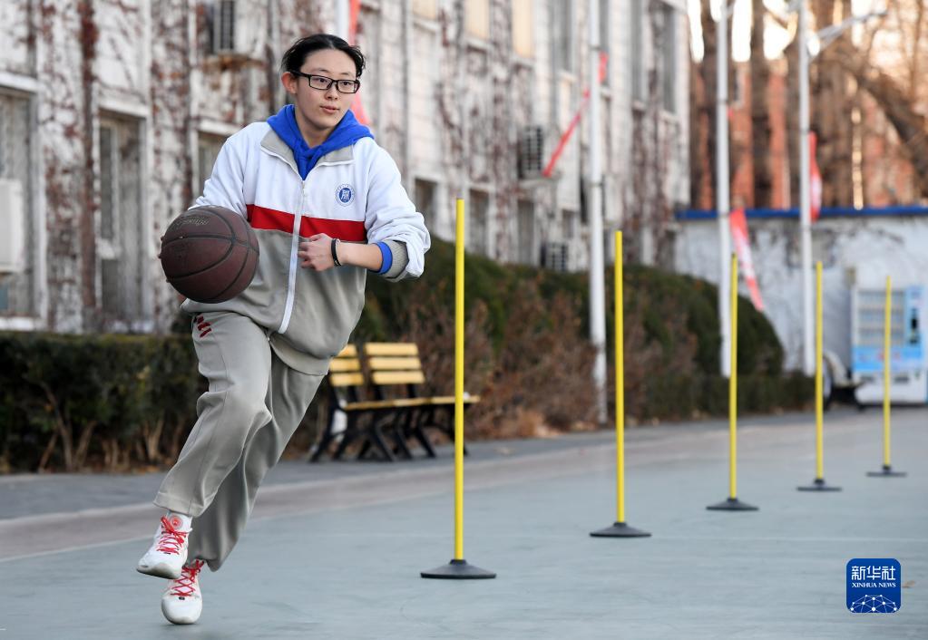 在北京科技大学附属中学,张蓝心在体育课上进行篮球基础练习(12月2日摄)。