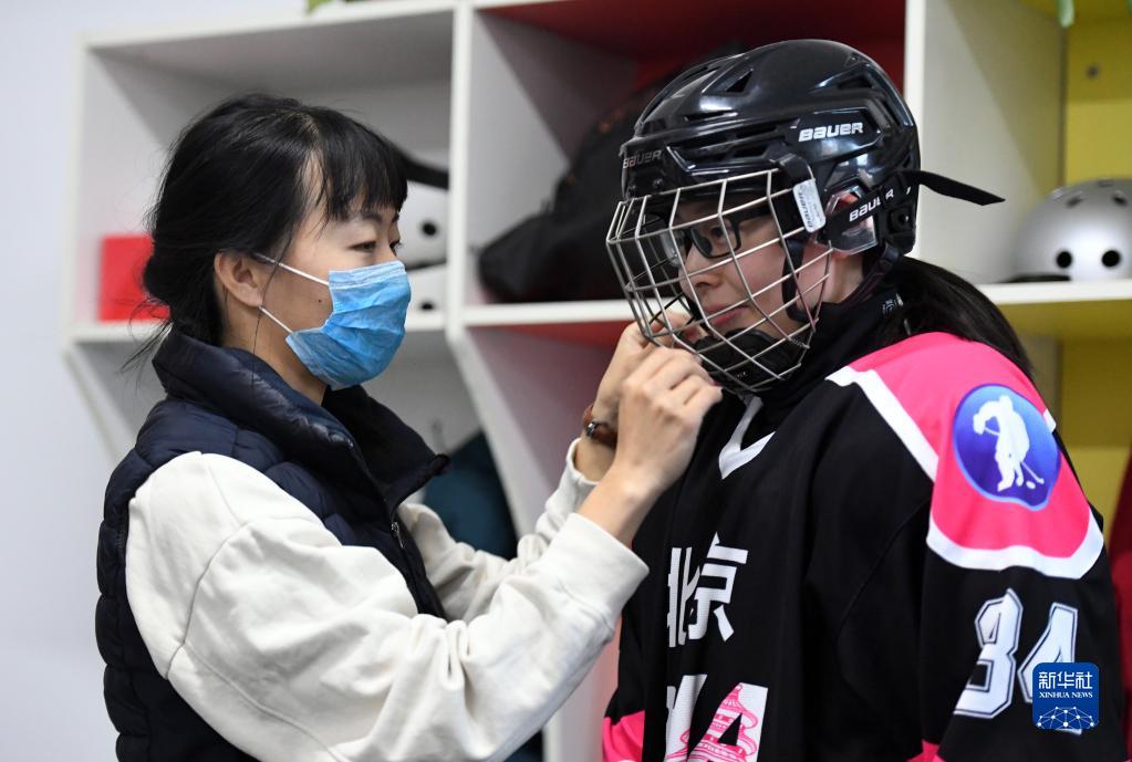 在北京科技大学附属中学冰上运动中心,体育教师刁璐璐(左)帮助张蓝心穿戴装备(12月2日摄)。