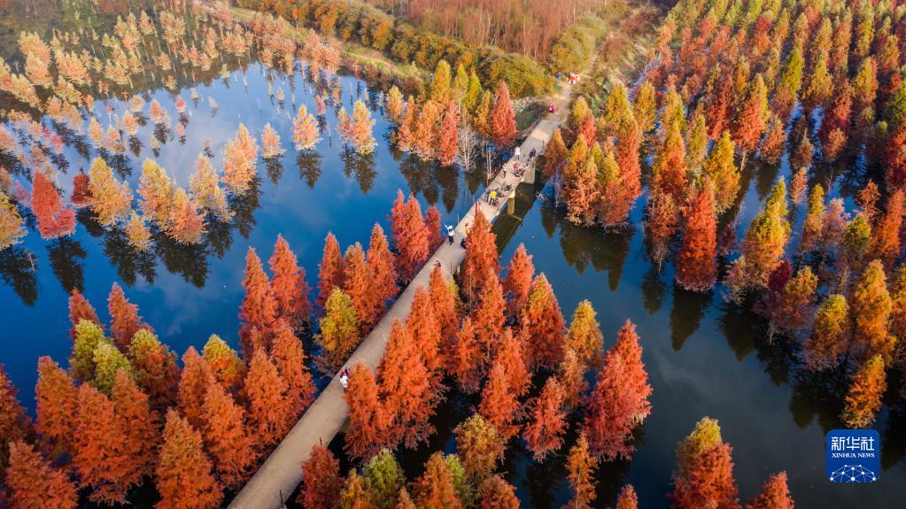 冬日,云南省昆明市盘龙区滇源街道甸尾村水杉湿地的水杉林色彩艳丽,景色如画。这片水杉湿地位于滇池上游、昆明松华坝水源保护区内。