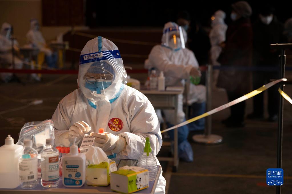 12月11日,在哈尔滨市香坊区哈尔滨理工大学核酸检测点,医护人员准备核酸采样。