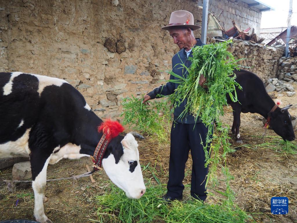 小多列老人在喂奶牛(6月23日摄)。