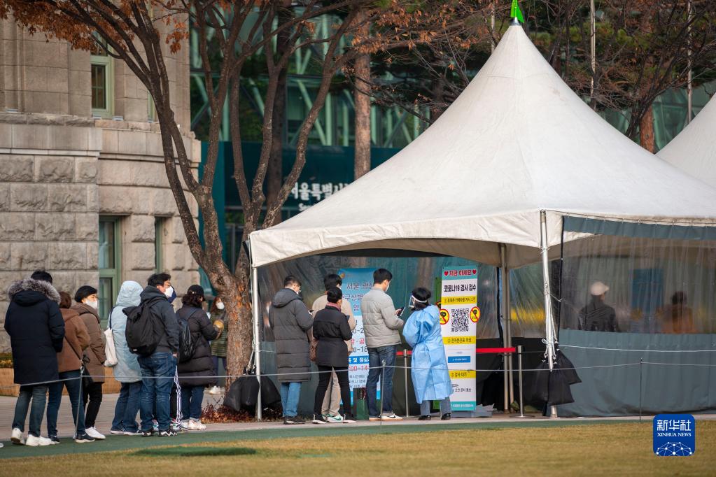 12月11日,人们在韩国首尔广场新冠检测点排队等待核酸采样。