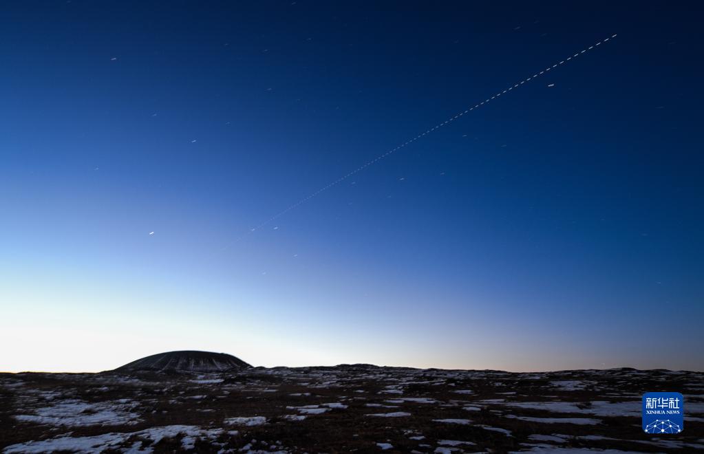 11月23日,在内蒙古自治区乌兰察布市察哈尔右翼后旗乌兰哈达火山群拍摄的中国空间站过境照片(轨迹为多张照片堆栈)。