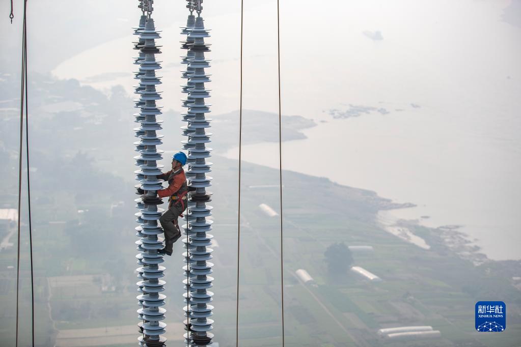 12月5日,在白鹤滩—江苏±800千伏特高压直流输电线路工程(重庆段)江津长江大跨越施工现场,工人在长江上空作业。