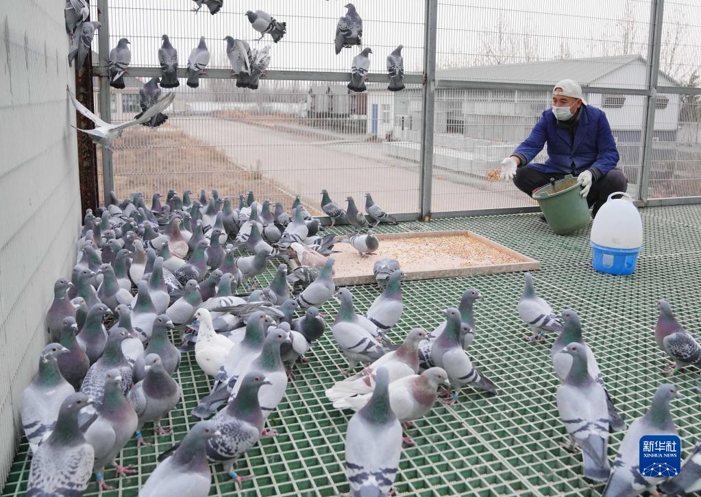 12月11日,迁安市大崔庄镇一家信鸽养殖基地的工人在给鸽子投放饲料。