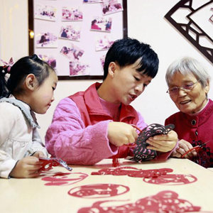 12月11日,在滨州市市东街道桃李社区新时代文明实践站,剪纸艺人(中)向居民介绍剪纸技艺。