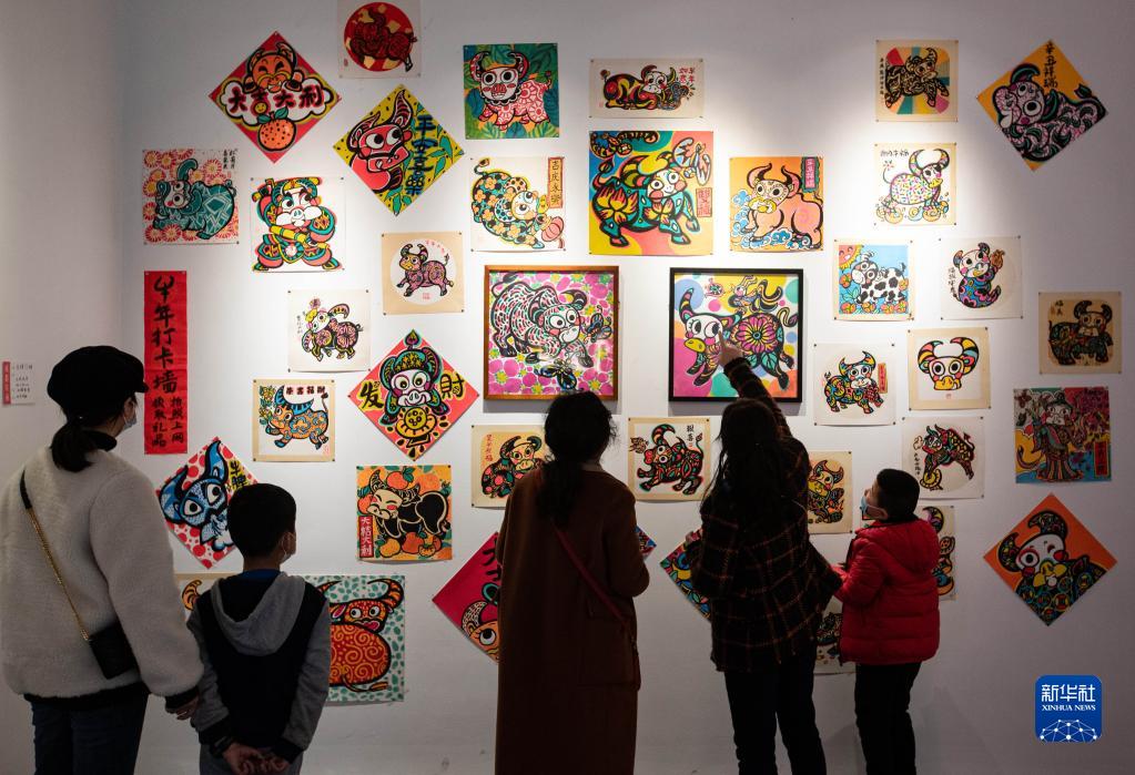 2月12日,在成都市人民公园,观众在观看成都年画展。新华社记者 江宏景 摄