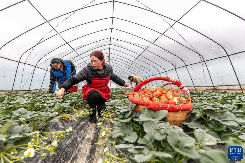近日,贵州省黔西市锦星镇白泥村生态草莓种植基地一片繁忙,村民采摘草莓抢鲜供应市场。近年来,黔西市大力调整产业结构,在社区、乡镇按照“合作社+公司+农户”的模式进行生态草莓种植,因地制宜发展农业经济,带动群众就业增收。