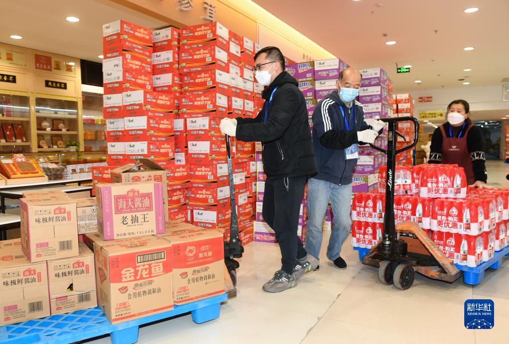 12月15日,在上虞区大通购物中心,工作人员在搬运需要配送的生活物资。疫情期间,该中心被临时征用为急需日用消费品配送中心。