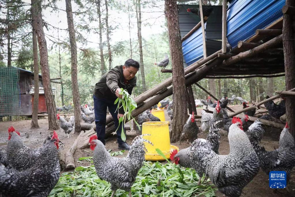 重庆市丰都县养殖户熊勇在给芦花鸡喂食(2020年11月16日摄)。