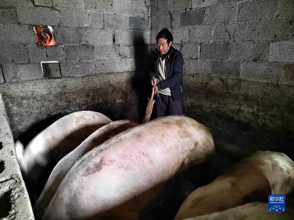 12月15日,重庆市奉节县平安乡养殖户汪圣兵在清理猪圈。