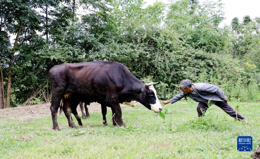 贵州威宁彝族回族苗族自治县观风海镇村民安国升在喂牛(8月6日摄)。