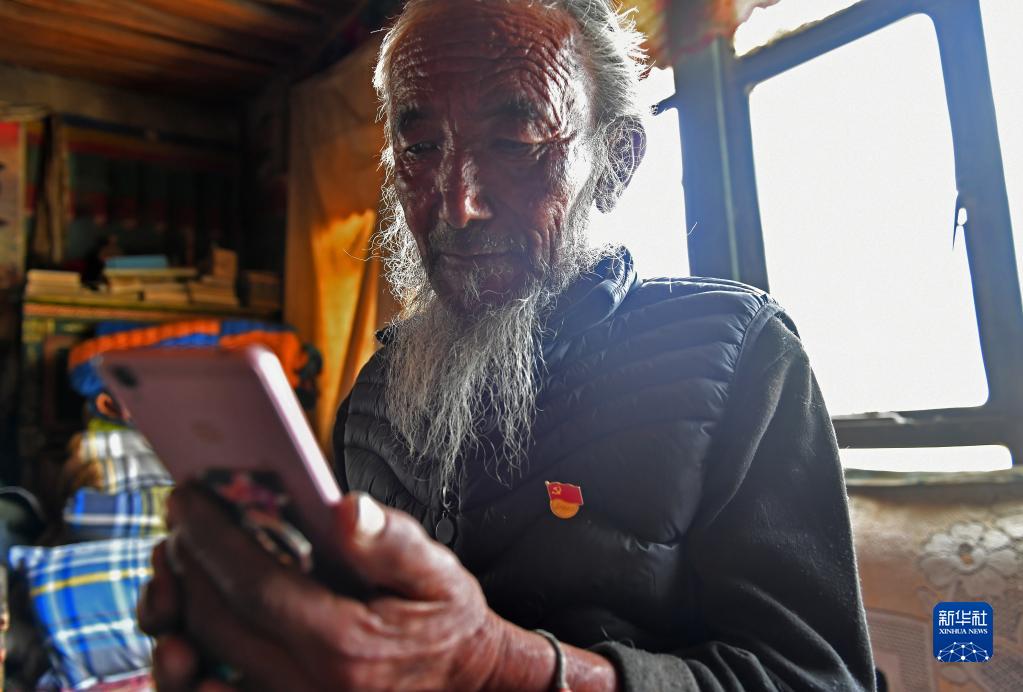 旺加老人在查看手机信息(5月12日摄)。新华社记者 孙瑞博 摄