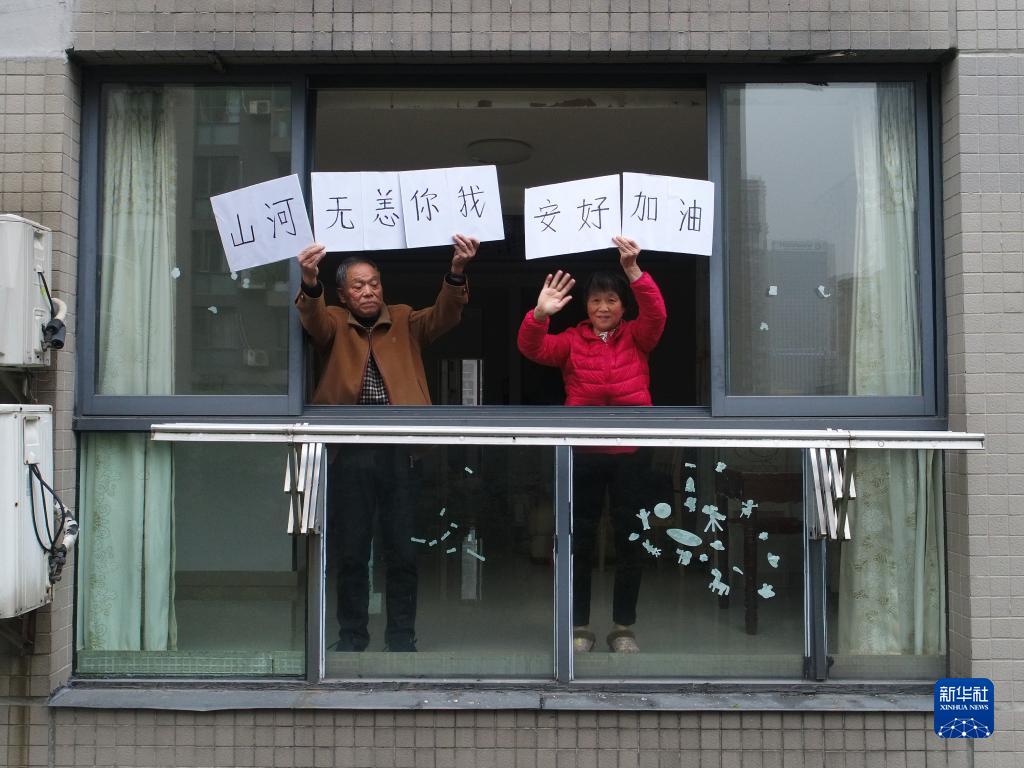12月16日,退休工人叶先生和妻子陈女士在家中展示他们的问候。两人都曾是军人,他们希望祖国和家乡尽快从这一次的疫情中走出来(无人机照片)。