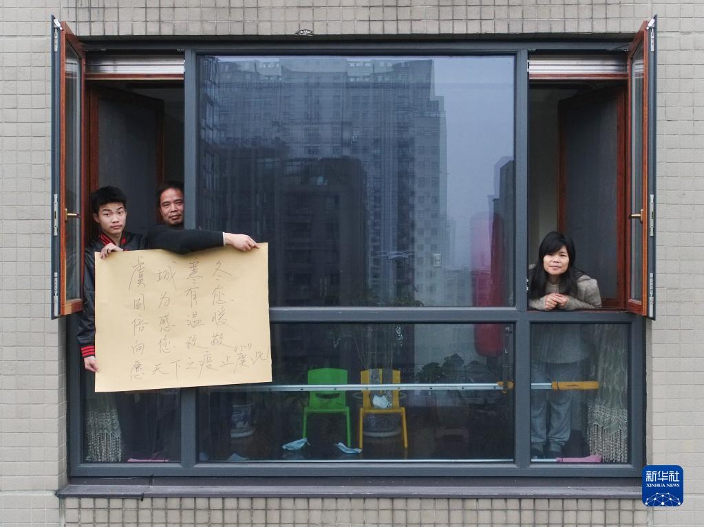 12月16日,公务员崔先生、教师邵女士夫妇和正在读中学的儿子在家中展示他们对医务人员、社区工作者和志愿者的问候(无人机照片)。