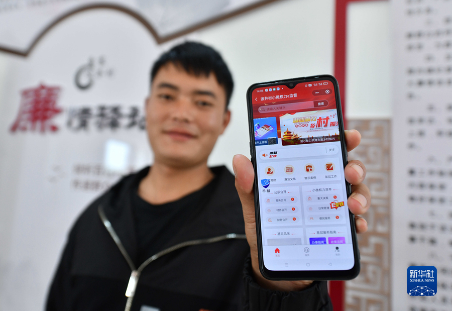 12月16日,在广西鹿寨县鹿寨镇波井村政务服务中心,村民展示“微权力监督e廉线”小程序。