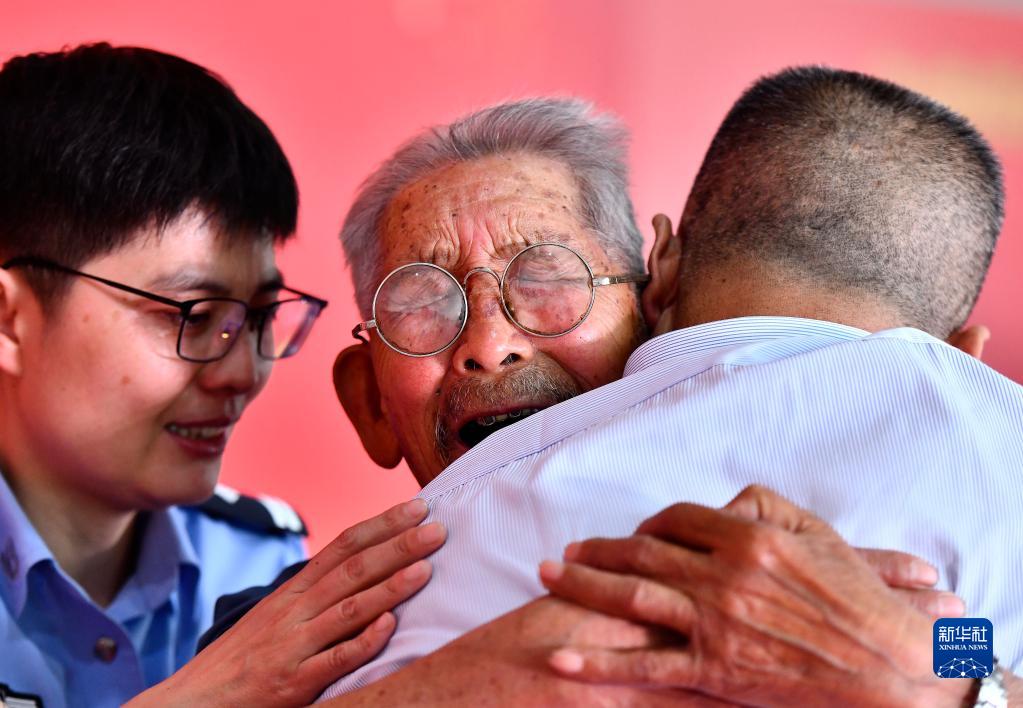 6月8日,公安部部署山东、四川、江苏、河南四省公安机关同步开展“团圆”行动认亲活动,帮助11组失散家庭实现团圆。这是在“认亲,我们在行动”济南主会场,90岁高龄的罗凤坤(中)紧搂着被拐58年的儿子罗亚军哭泣。