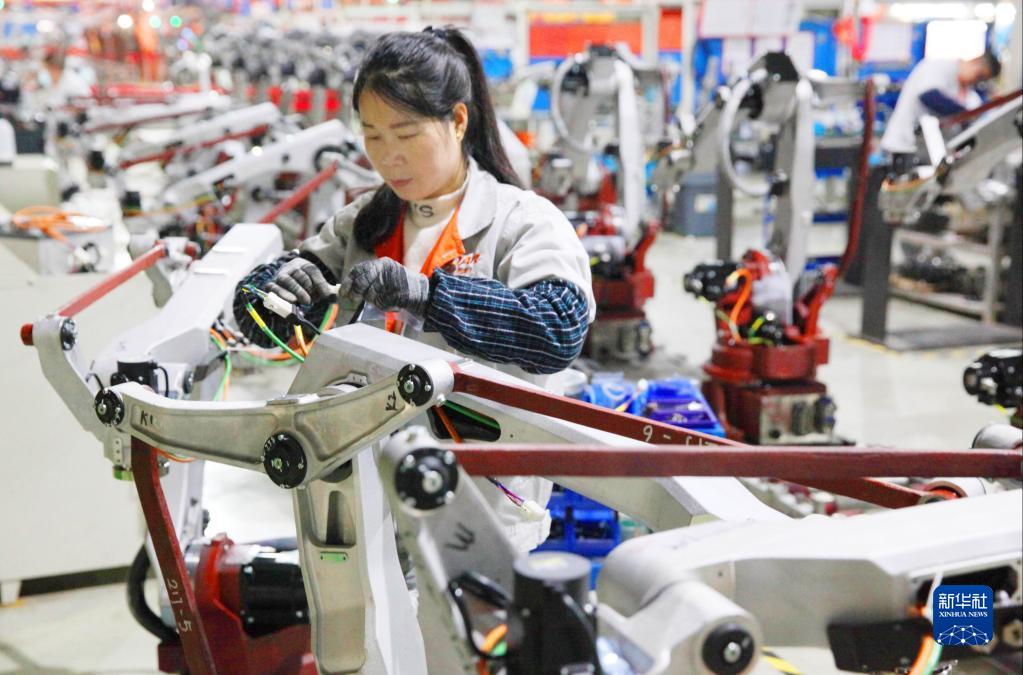 12月17日,在浙江省温岭市一家机器人生产公司,工人在组装和调试年终订单产品。