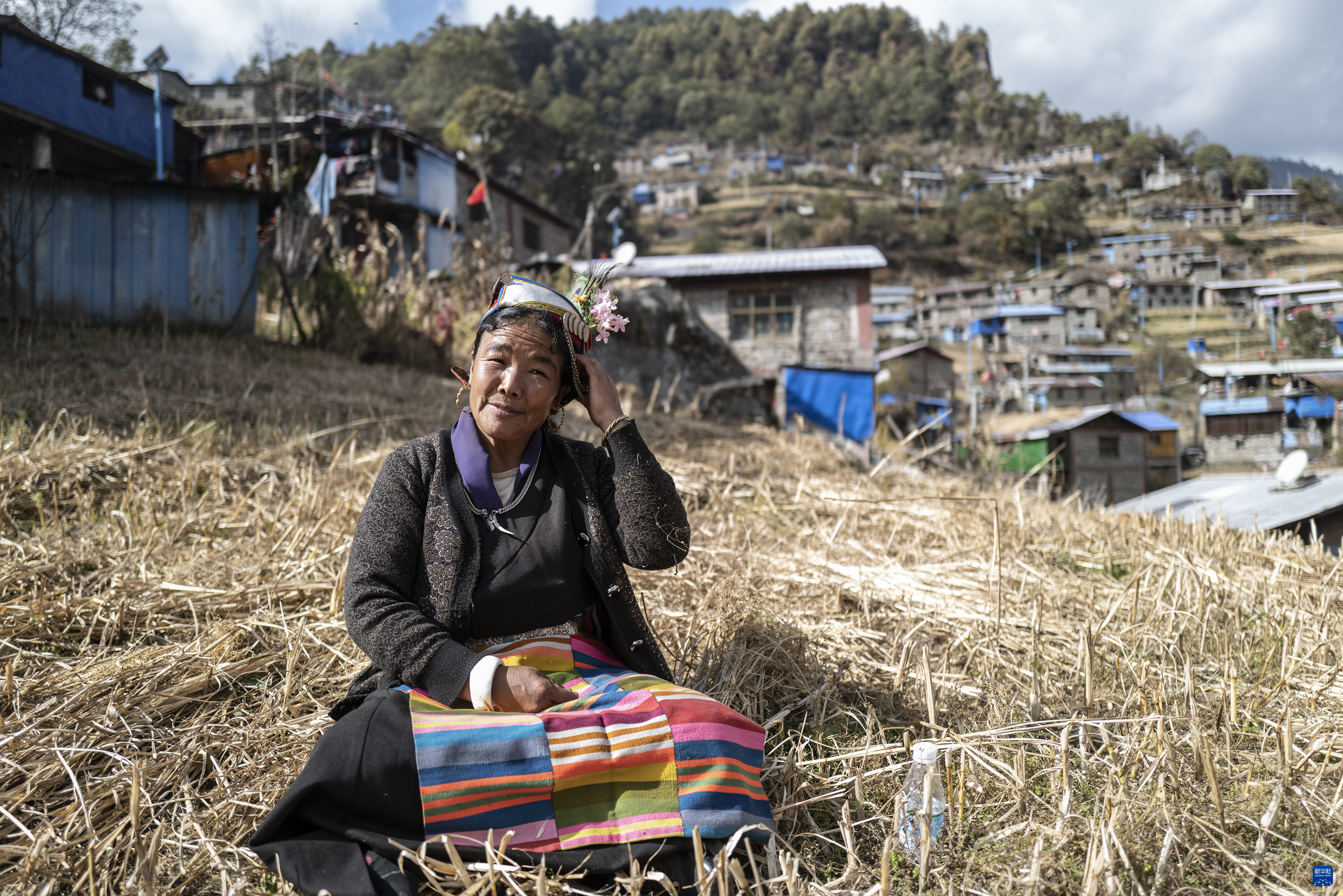 非遗陈塘夏尔巴歌舞代表性传承人朗嘎在山坡上演唱时调整自己的头饰(11月27日摄)。