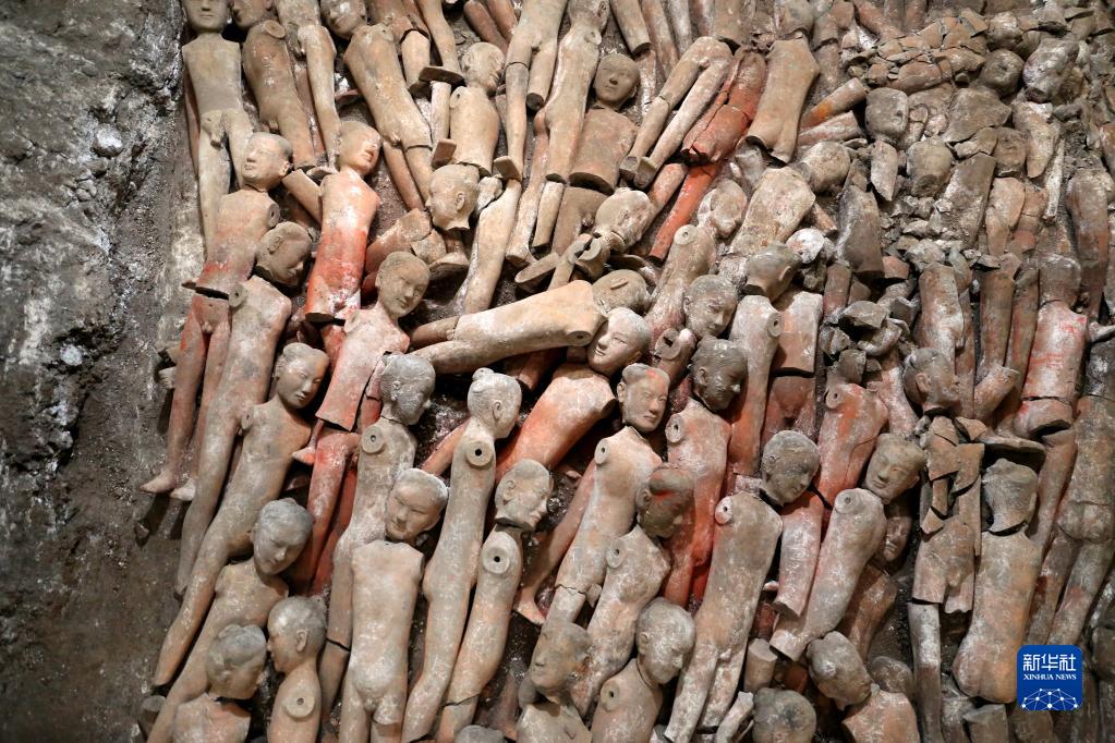 江村大墓外藏坑出土的着衣陶俑(10月8日摄)。