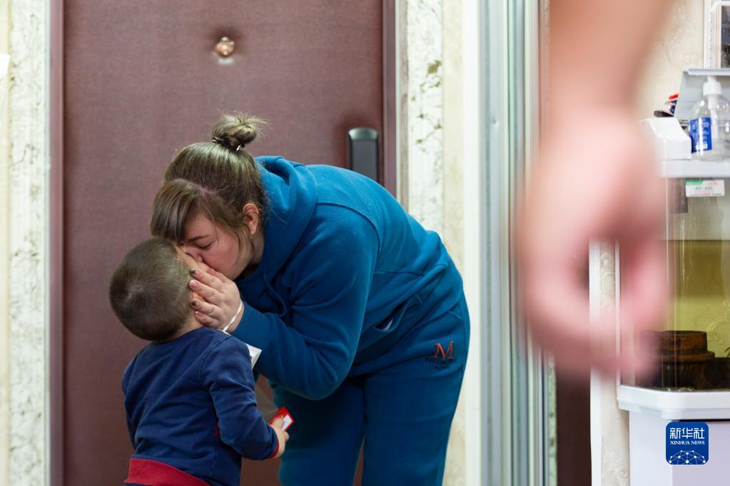 12月8日,在哈尔滨市松北区的家中,奥丽娅在离家工作前向家人告别。