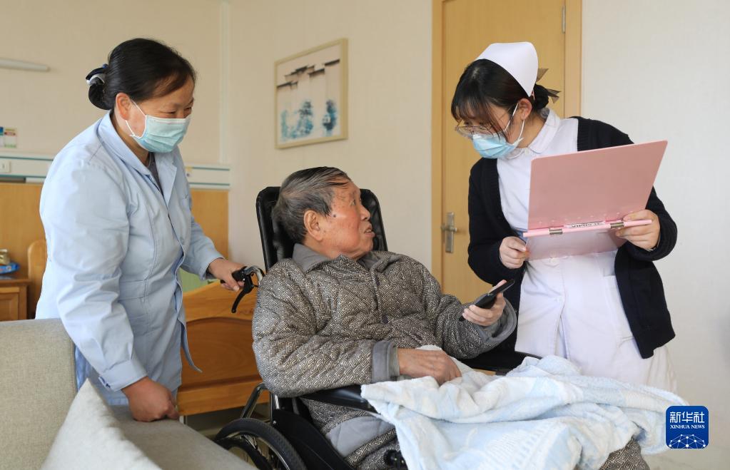 12月18日,在合肥市蜀山区清溪路社区一家护理院,护士(右一)在查房时询问老年人身体情况。