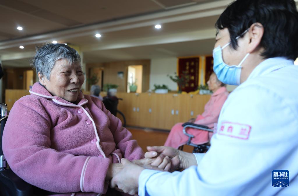 12月18日,在合肥市蜀山区清溪路社区一家护理院,护工在拉伸老年人手指,增强老年人上肢及手部活力。