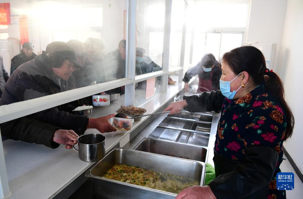 12月18日,在合肥市肥西县紫蓬镇五保供养服务中心,工作人员为老人盛饭。