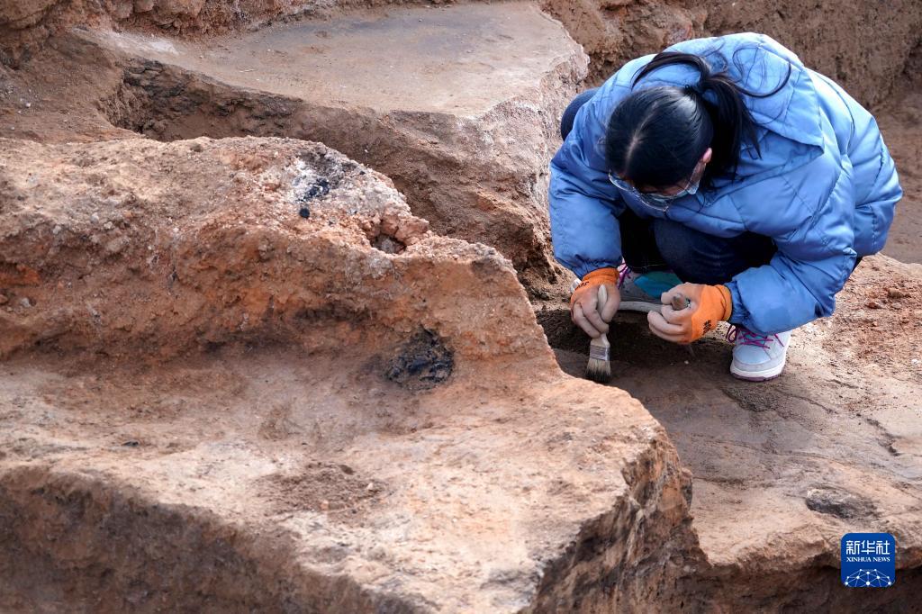 工作人员在苏羊遗址苏羊片区的核心生活区考古发掘现场作业(12月15日摄)。