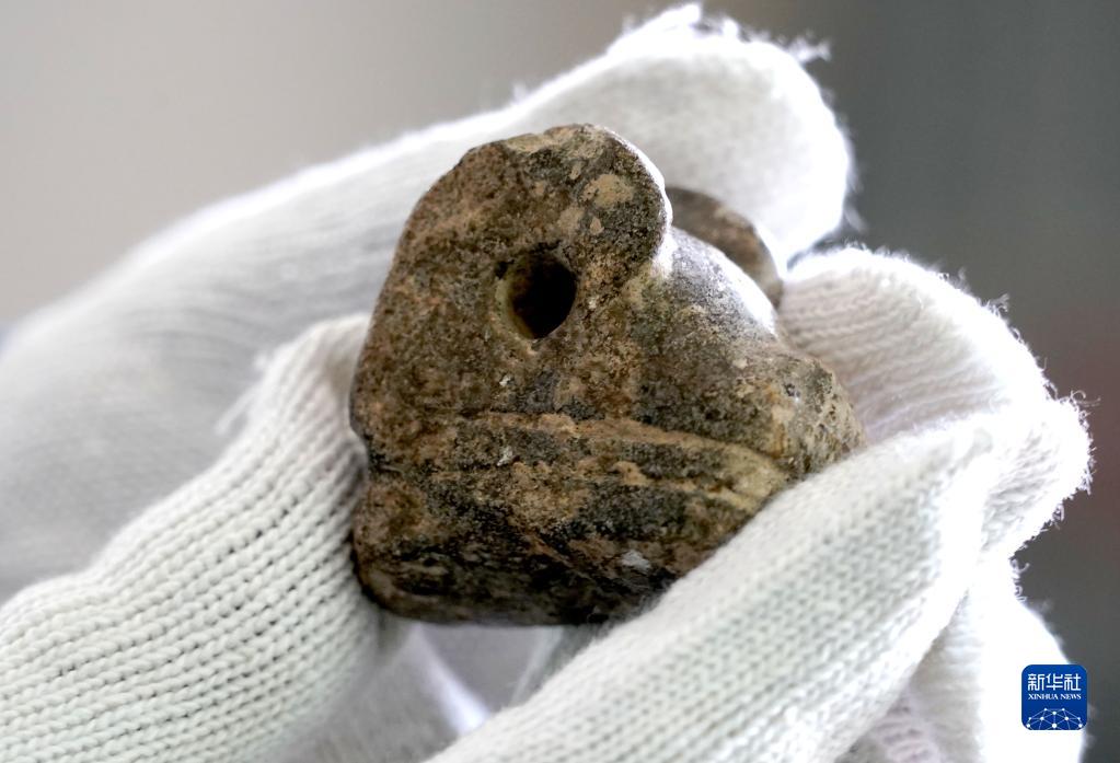这是苏羊遗址出土的外形似虎头的兽首石雕(12月15日摄)。