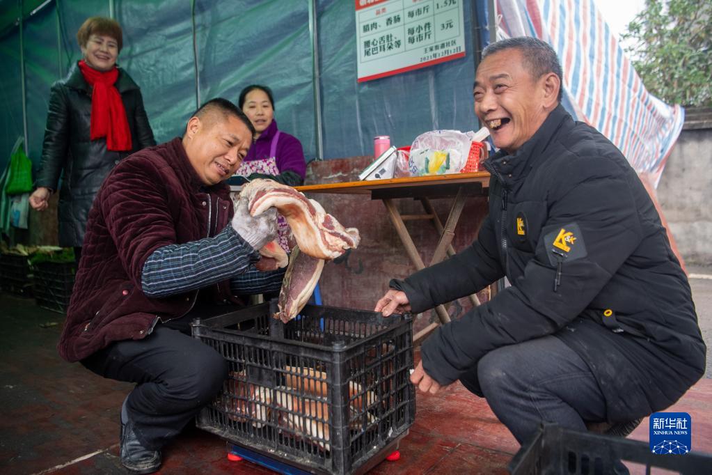 12月18日,在位于重庆市渝北区王家街道的“无烟熏制腊肉便民服务点”,工作人员(前左)在查看居民的原材料准备进行登记。