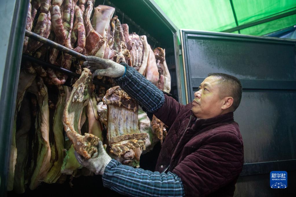 12月18日,在位于重庆市渝北区王家街道的“无烟熏制腊肉便民服务点”,工作人员将原材料放入“熏肉神器”。
