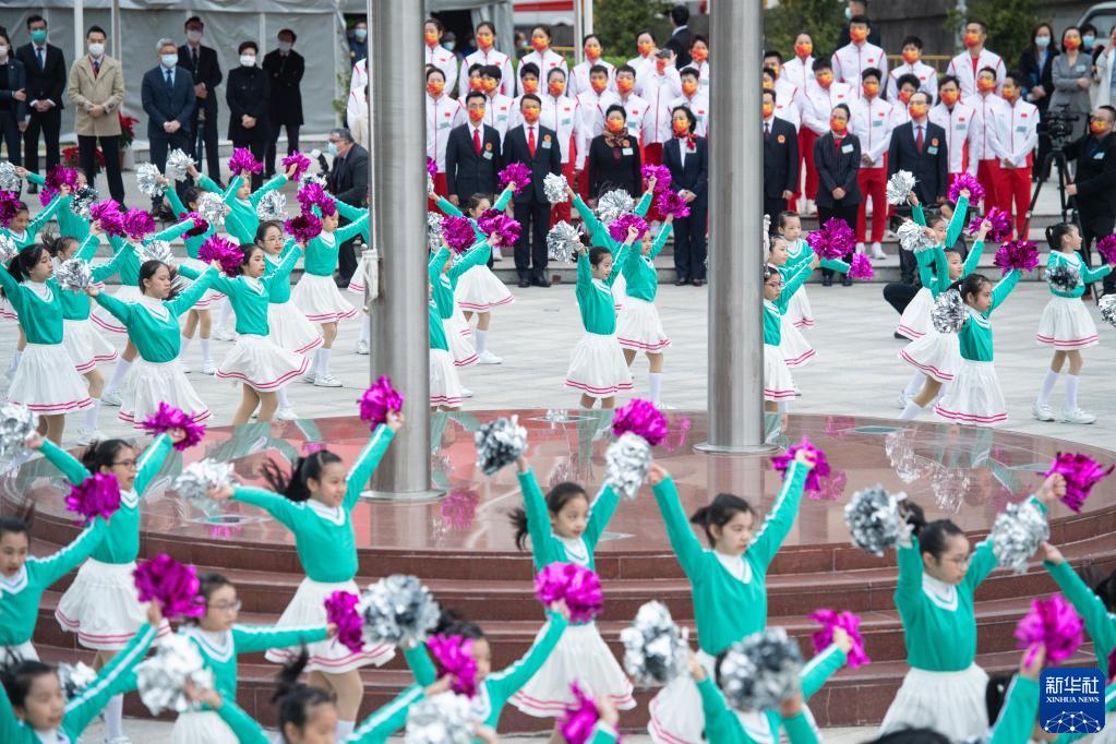 当日,内地奥运健儿访澳代表团在澳门金莲花广场参加庆祝澳门回归22周年升旗仪式。