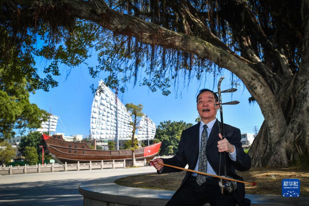 87岁的潮州音乐终身成就奖获得者郑炳钊在汕头樟林古港大榕树下,用椰胡奏唱潮州音乐所独有的“二四谱”(12月16日摄)。椰胡是用椰壳做琴筒,以潮汕当地海产血蛤的壳为“马”,撑起琴弦,是潮州音乐不可缺少的乐器。