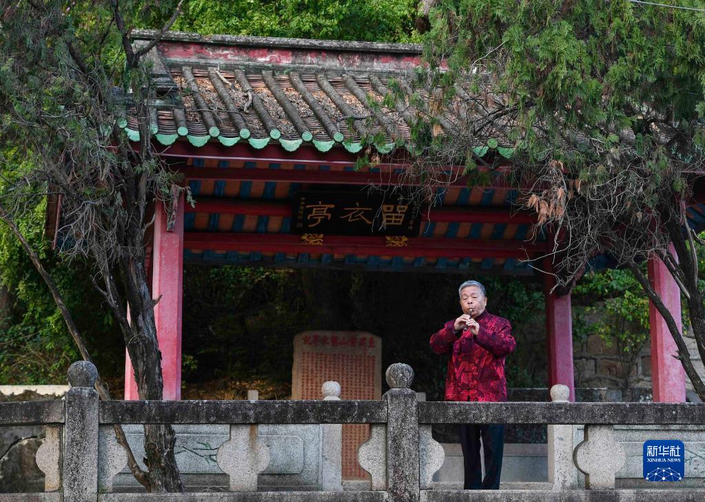 76岁的潮阳笛套演奏家郑相明在汕头灵山寺留衣亭用笛套中的管演奏《留衣情》(12月16日摄)。