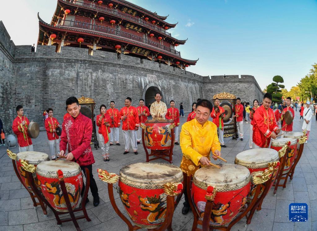 潮州大锣鼓非遗传人陈镇锡(后中)、广东民族乐团团长陈佐辉(前排左二)和丁泽楷(前排左一)带着潮州民间音乐团的年轻人在潮州广济门演奏潮州大锣鼓《狮子戏球》(12月14日摄)。