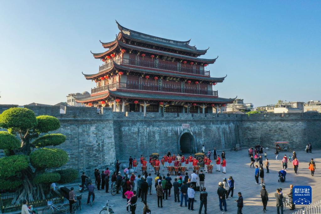 潮州民间音乐团的年轻人在潮州广济门演奏潮州大锣鼓《狮子戏球》(12月14日摄)。