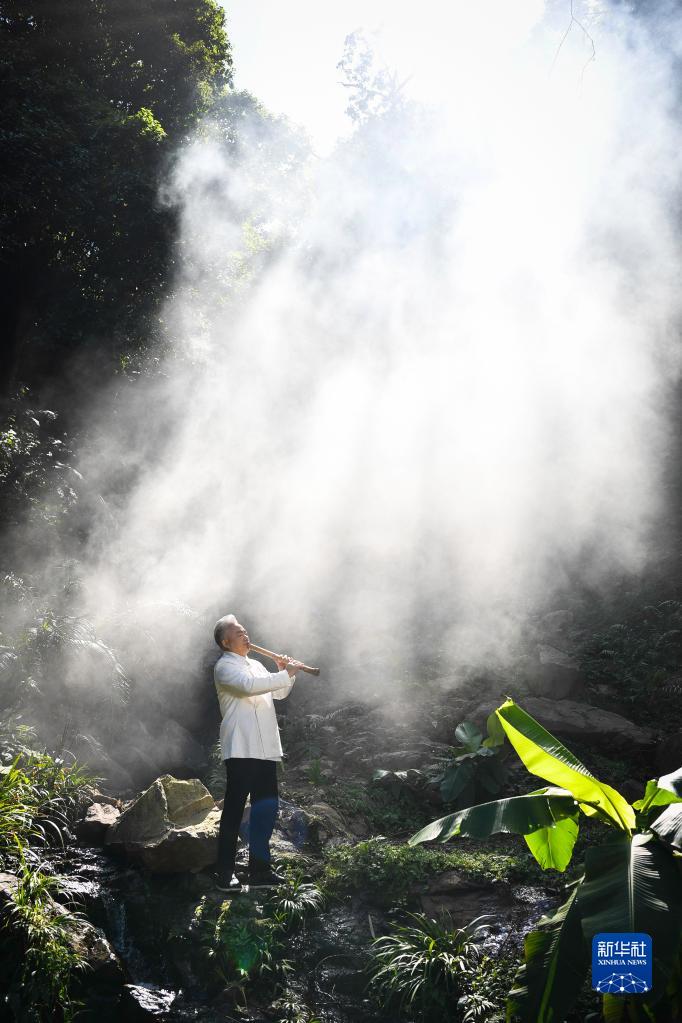 “国乐大师”方锦龙用尺八吹奏潮州音乐(12月1日摄)。