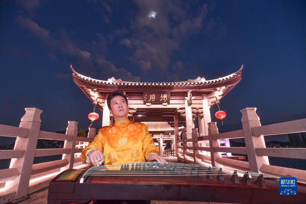潮州音乐研究学者、古筝演奏家陈浚辉在潮州广济桥上演奏潮州筝曲《粉红莲》(12月14日摄)。