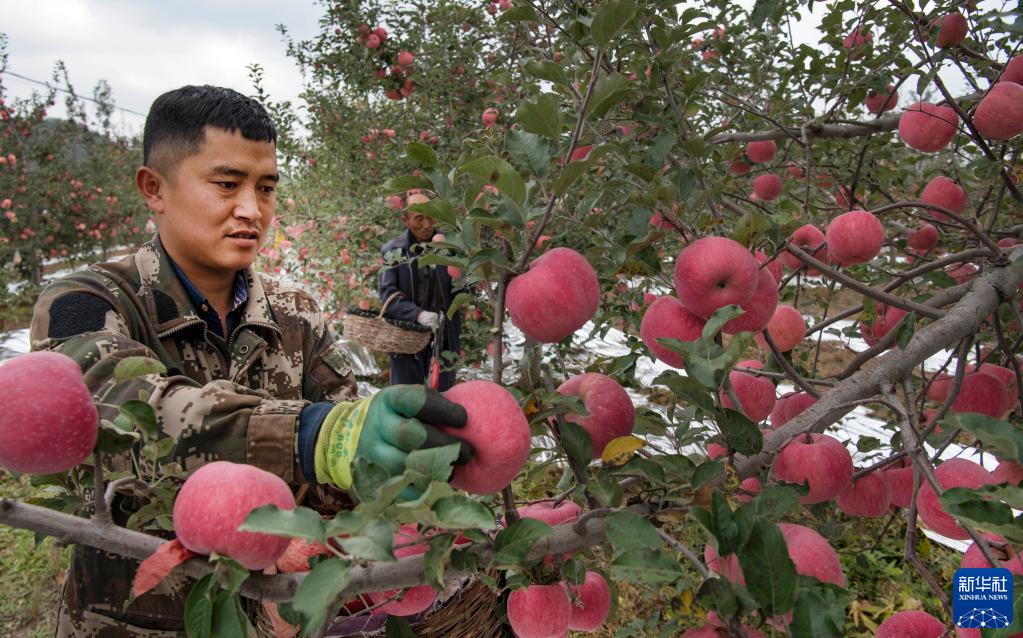 延安市志丹县双河镇李家湾村村民在集体果园采摘苹果(2019年10月22日摄)。延安苹果种植面积达到300多万亩。2019年5月全市整体脱贫摘帽,实现了生态保护和扶贫脱贫的双赢。