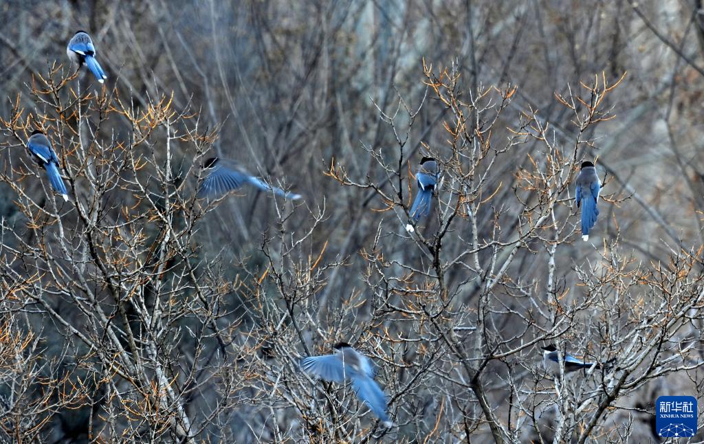 一群灰喜鹊在吴起退耕还林公园飞跃(12月20日摄)。