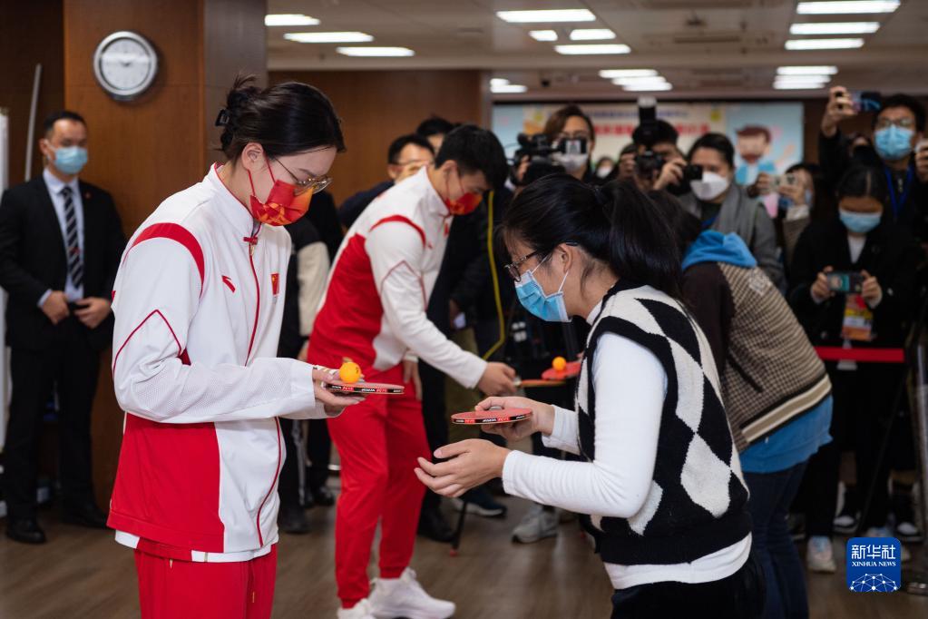 12月21日,在澳门街坊联合总会石排湾家庭及社区综合服务中心,内地奥运健儿代表团成员汤慕涵(前左)在互动游戏上接球。