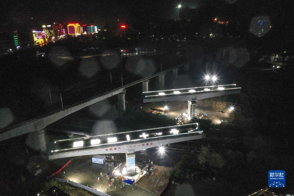 清远磁浮专线银盏特大桥双幅转体梁在转体过程中(12月21日摄,无人机照片)。