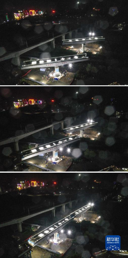 这张拼版照片为清远磁浮专线银盏特大桥双幅转体梁精准对接(12月21日摄,无人机照片)