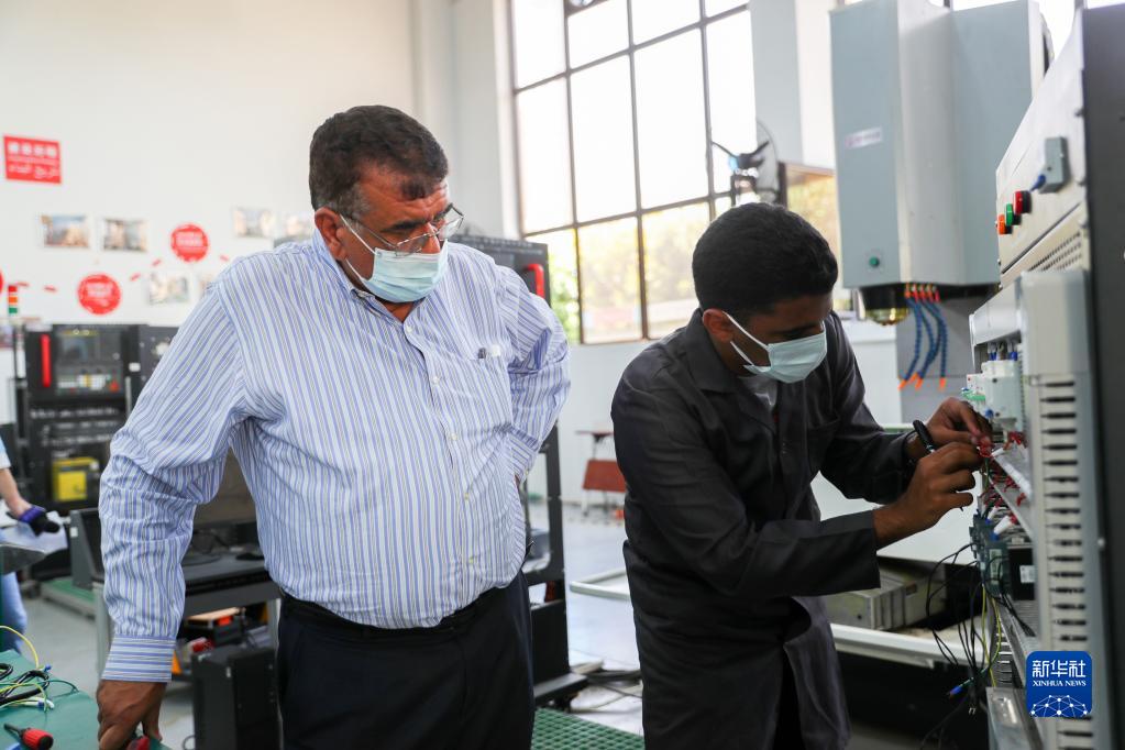 8月16日,在位于埃及首都开罗的艾因夏姆斯大学鲁班工坊,执行负责人穆罕默德·阿瓦德(左)查看学员易卜拉欣·加法尔对电路的操作。