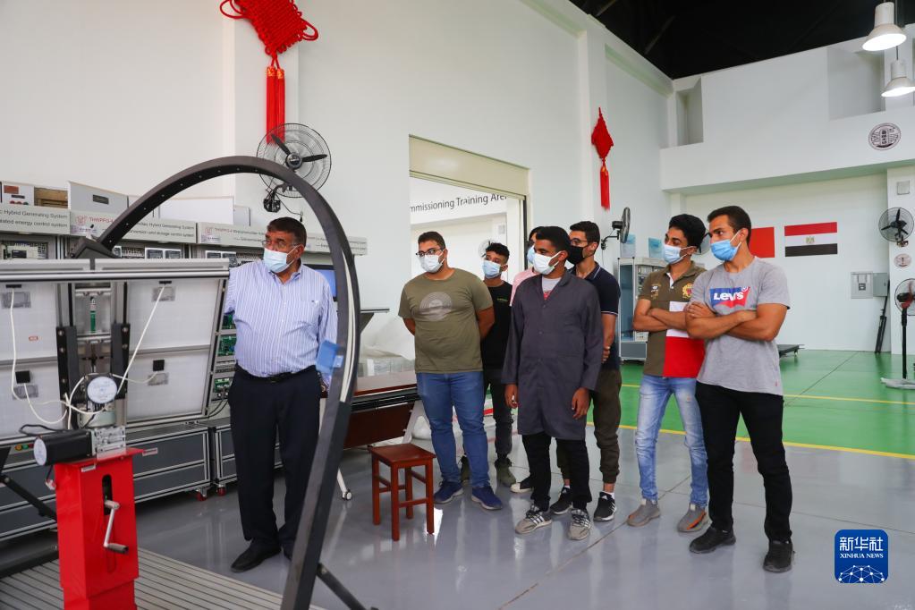 8月16日,在位于埃及首都开罗的艾因夏姆斯大学鲁班工坊,执行负责人穆罕默德·阿瓦德(左一)向学员介绍工坊情况。
