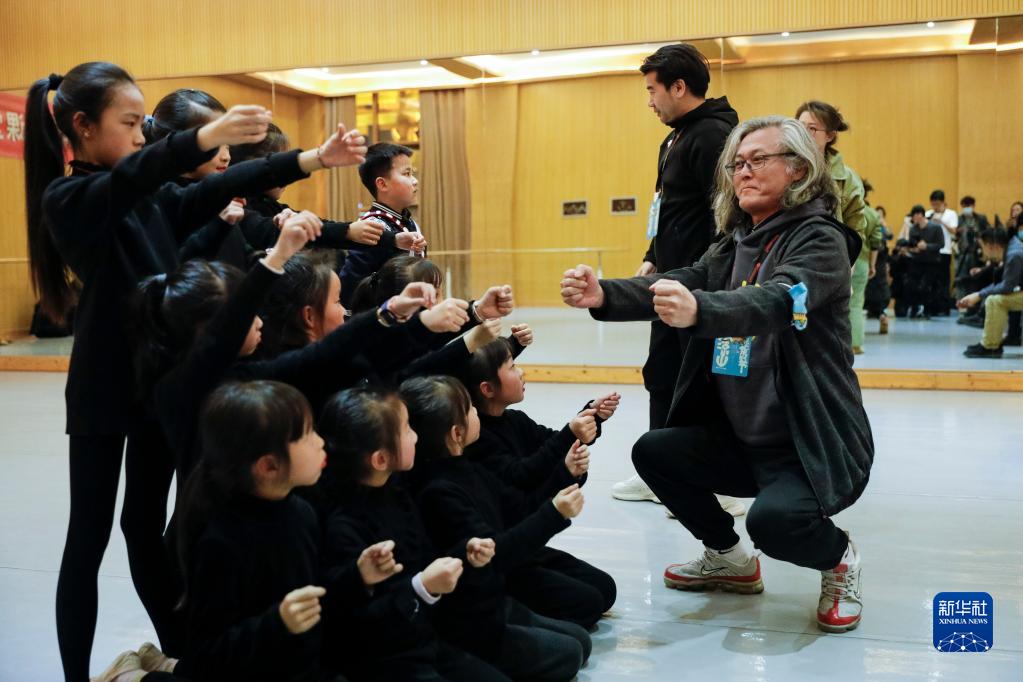 12月20日,在四川省凉山彝族自治州西昌市音乐基地的舞蹈教室内,中央戏剧学院导演系教授王良波(前右一)在指导孩子们表演。