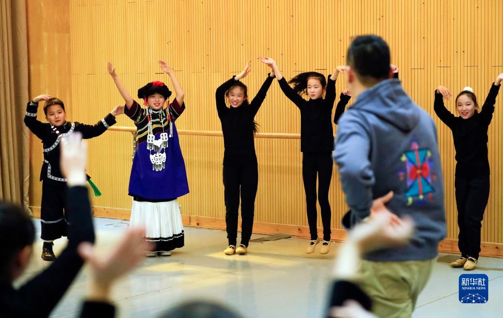 12月20日,在四川省凉山彝族自治州西昌市音乐基地的舞蹈教室内,孩子们在进行戏剧肢体游戏训练。